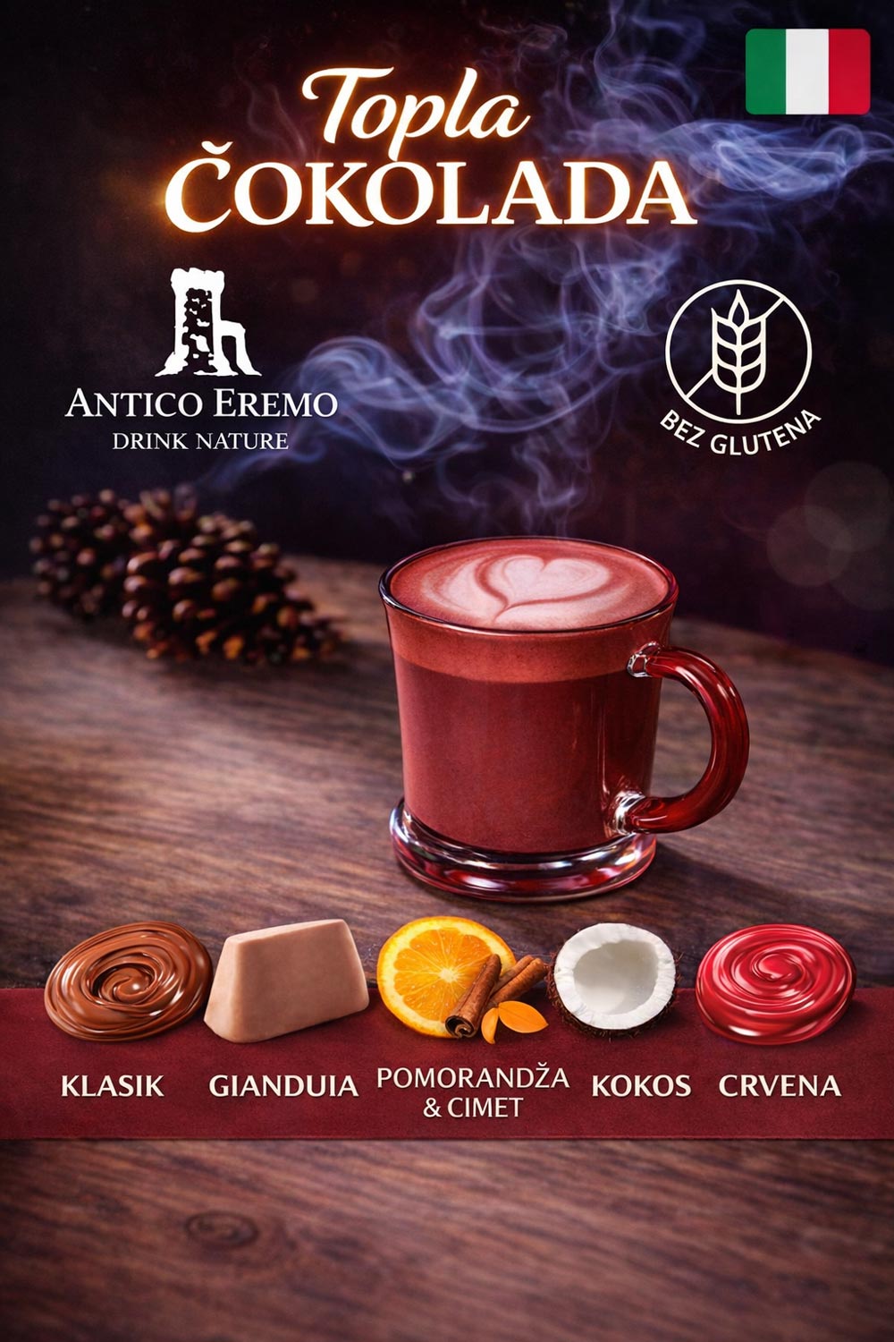 Antico Eremo iz Brescia, Italije od 1978 godine proizvodi rastvorljive mešavine za napitke, deserte,sladolede, sirupe kremove, tople čokolade i čajeve.